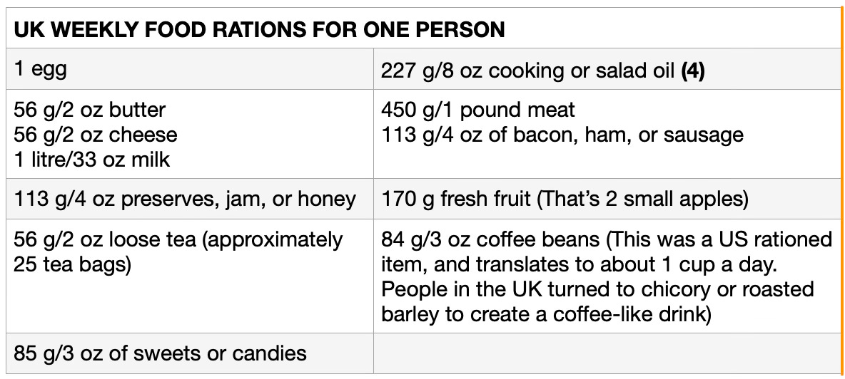 There are lots of resources concerning the UK Wartime Ration Diet and supplemental food programs. A simple search will bring up reams of information. Here are a few to start you on your way.