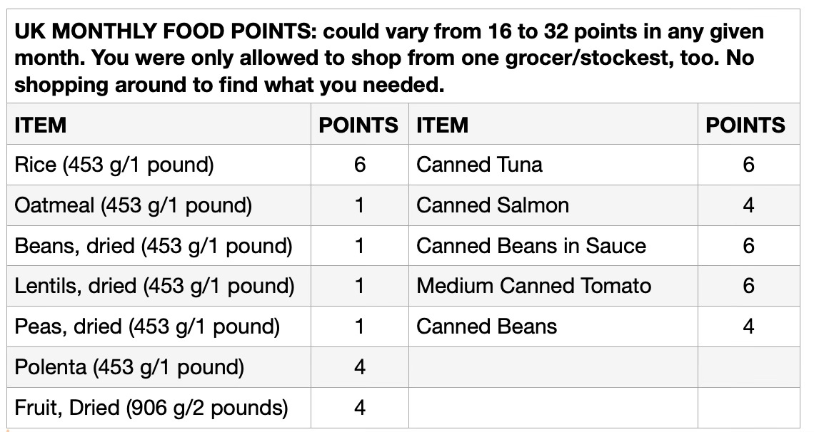 The premise was simple. Every person was allotted a certain amount of rations a week (eggs, dairy, meat, sugar), which were bulked out with items on a monthly point system (grains, beans, legumes, some tinned foods) and a selection of vegetables and bread that hopefully remained stable and always available.